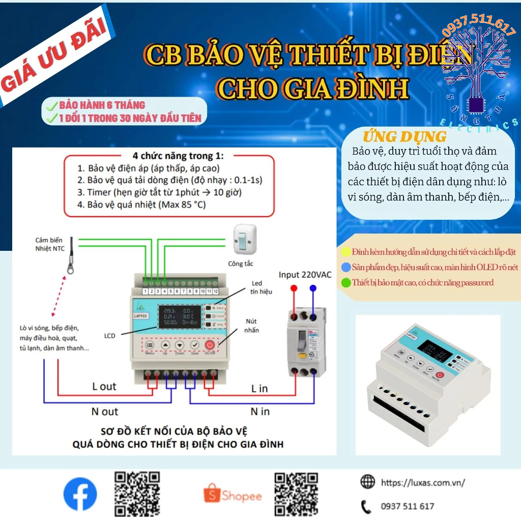 💯Hiện nay, các CB bảo vệ trên thị trường chỉ bảo vệ quá dòng, chưa được tối ưu trong việc bảo vệ, duy trì tuổi thọ và đảm bảo được hiệu suất hoạt động của các thiết bị điện dân dụng như: lò vi sóng, dàn âm thanh, bếp điện,… → do đó LAP103 chính là 1 chiếc CB tự động linh hoạt với nhưng đặc điểm sau:
