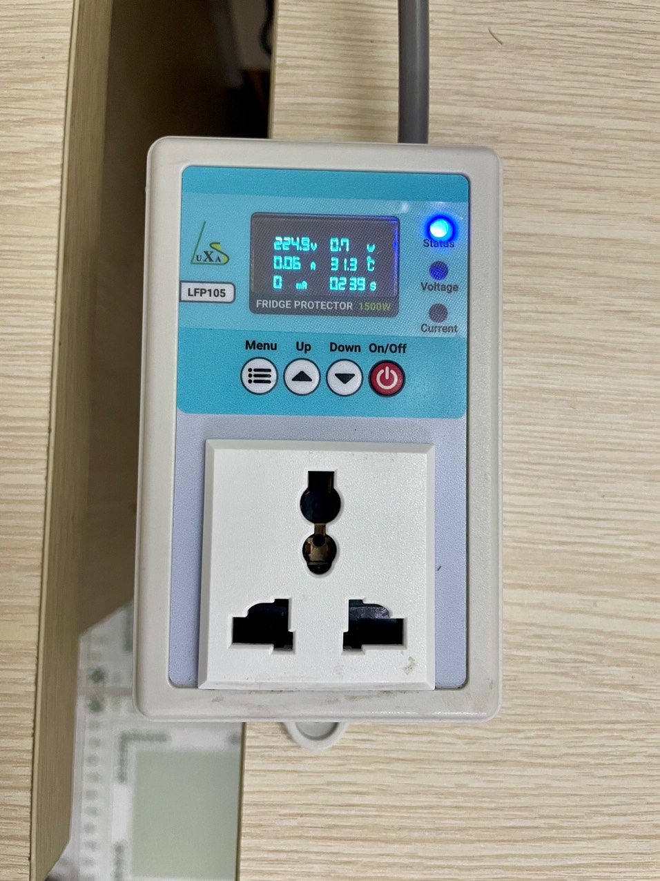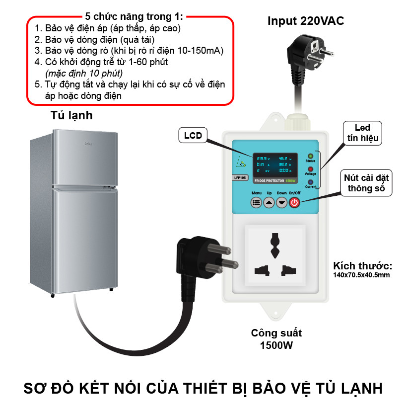 Nguồn điện không ổn định, chập chờn dẫn đến tình trạng nghẹt gas làm cho hư hỏng block, máy nén trong tủ lạnh. Nên LFP105 dùng để tự động ngắt nguồn điện khi có sự cố và có thể cài đặt thông số từ màn hình LCD. Kèm thêm chức năng khởi động trễ để đảm bảo rằng tủ lạnh không được bật tắt liên tục khi nguồn điện nằm ngoài phạm vi bảo vệ, tránh tình trạng nghẹt gas tủ lạnh. Khi điện áp đã ổn định, sau khoảng 5-7 phút, thiết bị bảo vệ tủ lạnh sẽ tự động cung cấp điện áp ngõ ra 220VAC cho tủ lạnh hoạt động trở lại. Lưu các sự cố điện trong máy.
