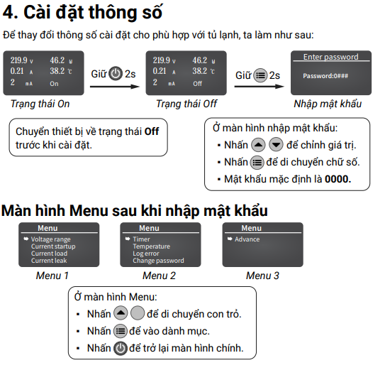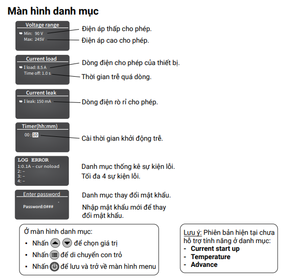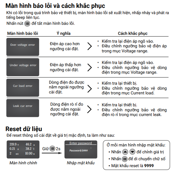 1. Bảo vệ điện áp (mặc định từ 170-245VAC)